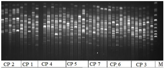 Electrophoregram of variability of the ISSR spectra distribution in Rhodiola rosea cenopopulations (CP) obtained with HB-12 primer; M is a marker; CP 1–CP 7 is a Nomber (No) of cenopopulation.