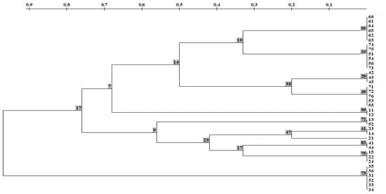 The UPGMA dendrogram, built using the Nei coefficient [], shows the genetic distance between samples, varying approximately from 0.20 to 0.76. This is quite a high level of genetic similarity between samples from all studied population. On this dendrogram of the R. rosea populations, 3 clusters were formed in accordance with the studied individuals; branch nodes have high support (bootstrap index > 50%) (Figure 5).
