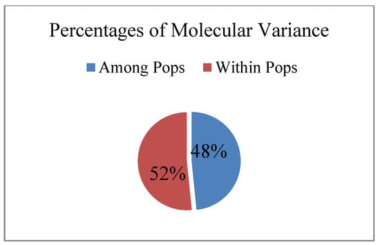 According to ANOVA analysis, the proportion of intrapopulation variability in the studied populations of R. rosea was approximately equal to the proportion of intraspecific genetic variability (Figure 6).