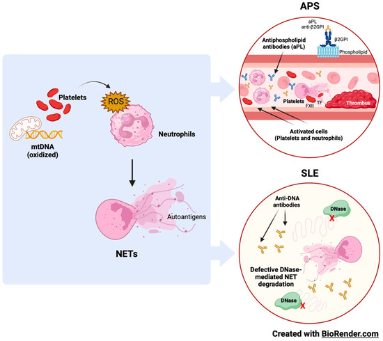 SLE and APS neutrophils present an activated phenotype [27]. Neutrophil activation induces excess ROS production, essential for forming neutrophil extracellular traps (NETs) through the induction of extensive DNA damage and repair that leads to chromatin decondensation [28]. The immune system of vulnerable individuals can recognize components released by NETs as autoantigens, thus influencing the pathogenesis of inflammatory and autoimmune diseases. Patients with SLE, but not APS, have defective DNase-mediated NET degradation [29]. In contrast, anti-β2GPI autoantibodies induce NETs and enhance thrombosis through their ability to bind and activate platelets, tissue factors, and coagulation factor VII [30] (Figure 2).