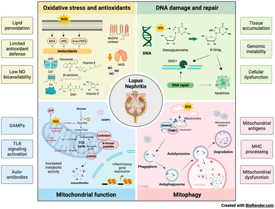Influence of OS, DNA damage, antioxidants, mitochondrial function and mitophagy on the development of LN. Oxidation leads to organic damage characteristic of SLE, especially in LN. Increases in LPO due to OS, limited antioxidant defense, and low NO availability contribute to the injury observed in LN. The balance between oxidation and DNA repair is altered in patients with LN, accumulating the marker of oxidative DNA damage (8-OHdG), genomic instability, and cellular dysfunction. Additionally, metabolic abnormalities influence the nature and state of activation of the kidney’s immune cell infiltrate, highlighting the importance of mitochondrial function in developing diseases such as LN through Danger-Associated Molecular Patterns (DAMPs), TLR activation, and the production of autoantibodies. Finally, aberrant or defective mitophagy is central to the pathology of LN as it facilitates the release of mitochondrial antigens, promotes their processing by major histocompatibility complex (MHC) molecules, and contributes to mitochondrial dysfunction.