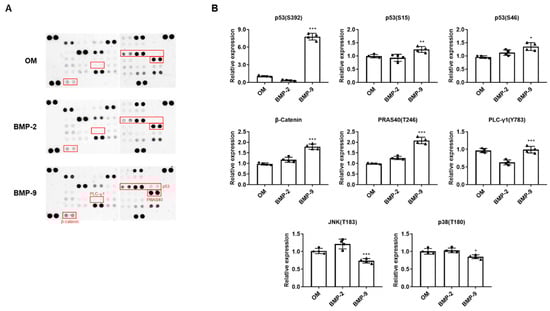 Comparison of phosphorylation arrays according to osteogenic differentiation using BMP-2 and BMP-9. The membrane array results compare changes in protein phosphorylation due to BMPs (A), and through quantification, factors that were significantly upregulated or downregulated due to BMP-9 were selected (B). OM; osteogenic induction media (n = 4; * p < 0.05, ** p < 0.01, *** p < 0.001).