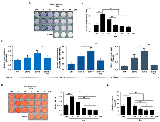 Effects of Pfα in osteogenic differentiation. A dose-dependent reduction in the degree of osteogenic differentiation due to the p53 inhibitor was confirmed through ALP staining (A,B), and the expression of mRNA levels of the osteogenic factors involved in time-dependent differentiation also decreased (C). The degree of calcium deposition was improved with BMP-9, then it was significantly downregulated by Pfα (D,E). (n = 3; * p < 0.05, ** p < 0.01, *** p < 0.001).