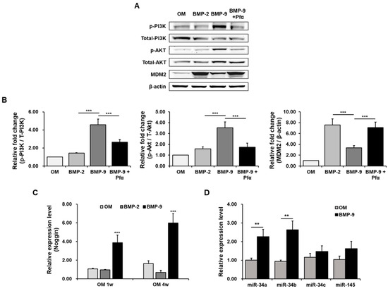 Mechanism of action of BMP-9 and p53. Western blotting and quantification graph to confirm the PI3K/AKT/MDM2 pathway (A,B), and mRNA expression data of each antagonistic factor noggin (C) and micro-RNA group (D) to confirm the function of BMP-9 and p53 (n = 3; ** p < 0.01, *** p < 0.001).