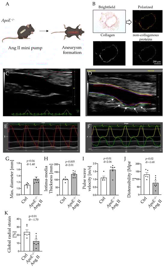 ApoE−/− mice were fed a high-cholesterol Western diet for 12 weeks to induce atherosclerosis (A). Picrosirius Red-stained aortas were visualized in brightfield and polarized light for collagen quantification (B). Binarization by splitting red and green channels was utilized to separate collagen (red) and non-collagen proteins (green). White pixels in the binarized images were counted to determine total collagen within the samples. Paravertebral view in B-Mode of the abdominal aortas in control (C) and ApoE−/− mice after 28 days of Ang II infusion (D); arrows indicate abdominal aortic aneurysm). Longitudinal images of the aorta were acquired. Borders of the vessel wall were defined in VevoVasc 1.2 software, and movement of lumen-intima border (E), ventral (green), and dorsal (yellow) outer vessel wall were traced by speckle tracking (F). Maximum diameter (G), intima–media thickness (H), pulse-wave velocity (I), wall distensibility (J), and global radial strain (K) of the carotid arteries are presented for Ang II-infused ApoE−/− mice and control animals; n = 5–7. Scale bar: 200 µm.