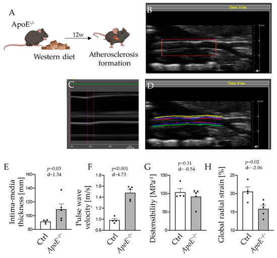 To assess properties of the arterial wall in ApoE−/− mice after 12 weeks of Western diet feeding (Figure 2A), ultrasound analysis of the carotid artery was performed (representative recordings are shown in Figure 2B–D). IMT was significantly increased in atherosclerotic ApoE−/− mice compared to controls (91.4 ± 1.3 µm vs. 109.3 ± 7.9 µm, p = 0.03; Figure 2E). In addition, PWV was significantly accelerated in those animals (0.98 ± 0.03 m/s vs. 1.48 ± 0.06 m/s, p < 0.001; Figure 2F), indicating arterial stiffening.