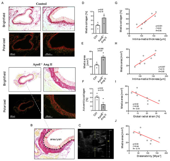 Representative images of control and AAA mice in brightfield and polarized light (A) with histological (B) and sonographic (C) cross-section of AAA region. Collagen content (D) and area (E) of the tunica media and collagen content of the tunica adventitia (F) as assessed by automated analysis of Picrosirius Red-stained cross-sections. Correlation of media collagen content with intima–media thickness (G) and of media area with intima–media thickness (H), global radial strain (I), and distensibility (J) as assessed by high-resolution ultrasound. Scale bars: 200 µm (left panel) and 100 µm (right panel); n = 4.
