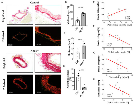 Aortic sections of ApoE−/− mice fed a Western diet and controls were stained with Picrosirius Red, and collagen content was visualized in polarized light (A). Representative images show collagen content (B) and area (C) of the tunica media and collagen content of the tunica adventitia (D) as assessed by automated image analysis. Correlation of media collagen content with pulse wave velocity (E) and global radial strain (F) and of media area with distensibility (G) or global radial strain (H) as assessed by high-resolution ultrasound. Scale bars: 200 µm (left panel) and 100 µm (right panel); n = 4–5.