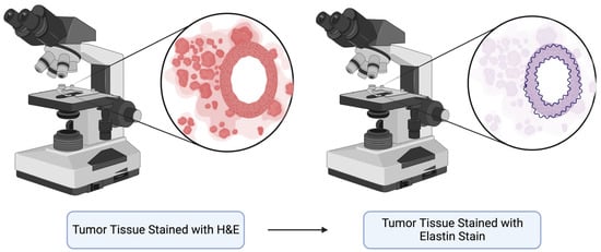 Additionally, elastin stains can provide evidence of structural changes that may not involve venous invasion. An example is the use of elastin stain in pulmonary adenocarcinoma to demonstrate vascular and pleural invasion [61]. Using an elastin stain can also help differentiate between arteries and veins when the histologic sample does not portray apparent determining factors and, thus, invasion by the tumor cells [61]. An elastin stain to assess the pleural tissue is used for staging in pulmonary adenocarcinoma by examining the presence of cancer cells beyond the outer elastic layer or beyond this outer layer and onto the visceral pleura [61]. An important finding in this study was the importance of the elastin tissue structure seen upon staining. The study found that the tissue architecture may already be altered when pulmonary adenocarcinoma arises in the presence of a preexisting condition such as emphysema. If the elastin pattern in the malignancy resembles the preexisting condition, the structural alterations are most likely due to the condition and not the tumor [61]. Elastin stains can also help differentiate hepatic tumors. Determining between segmental atrophy of the liver and sclerosing cavernous hemangiomas can be difficult given that the latter can often mimic the nodular elastosis stage of segmental atrophy [62]. With the use of Verhoeff’s elastin stain, both segmental atrophy and sclerosing cavernous hemangiomas showed some levels of elastin, but only segmental atrophy showed elastin to be densely and diffusely positive in the majority of the samples as opposed to only one of the sclerosing cavernous hemangiomas [62]. These findings suggest that elastin is a useful stain when segmental atrophy is suspected.