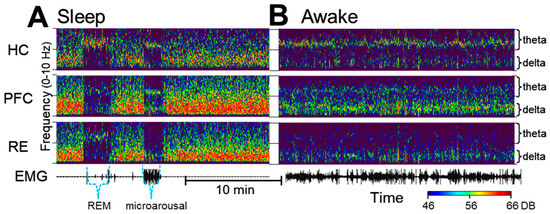 Delta and theta oscillations during sleep and waking under control conditions. (A). Time–frequency plots show wide-band delta activity covering the entire 1–4 Hz range during slow-wave sleep, interrupted by short episodes of rapid-eye-movement (REM) sleep and microarousals characterized by narrow band oscillations in the theta (~7 Hz) and in the delta (~2 Hz) bands. Note the theta in all three signals during REM sleep and the narrow-band delta rhythm in the prefrontal cortex (PFC) and the thalamic nucleus reuniens (RE) along with PFC and HC theta in a state of microarousal. (B). In waking, locomotor activity (see electromyogram, EMG) is accompanied by theta oscillations which are the strongest in the hippocampus (HC) but are also present in the PFC, coinciding with narrow-band delta oscillations which are strongest in the PFC but are present in the HC and in RE as well.