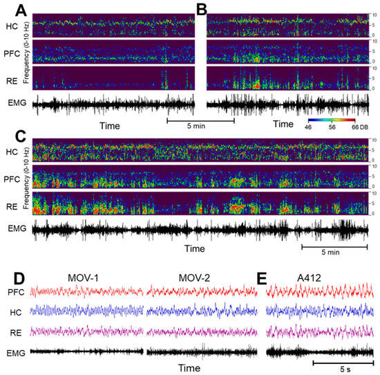 The dopamine 4 receptor (D4R) agonist’s effect on the activity of the hippocampus (HC), prefrontal cortex (PFC) and thalamic nucleus reuniens (RE). (A–C). Time–frequency plots of network activity in two control segments, showing natural variations in delta oscillations (A,B) and a strong increase in delta coinciding with theta in the HC after an injection of A-412997 (C) in a representative experiment. (Power scales (46–66 DB) are identical in all figures and are set to match the strongest signal peaks in (C)). (D,E). Traces (voltages) on an extended time scale in two control segments of active waking ((D), MOV-1 and MOV-2; note the electromyogram (EMG) activity and the dominant theta in the HC and RE) and after the A-412977 injection (E); note the large delta waves in the PFC and RE).