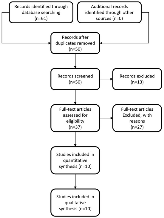 The initial search of the online literature resulted in a total number of 61 articles, while no other articles were identified by searching the current gray literature. Following removal of duplicates, the total number of articles was brought down to 50. These studies were screened based on their title and abstract and this process yielded 37 articles eligible for full-text analysis. Following full-text analysis, 27 articles were excluded since their methodology or their design/protocol did not investigate the same PICO question as the one investigated in our study, or because no full text was available, no control group was used, or data were insufficient. In the end, 10 articles [19,20,21,22,23,24,25,26,27,28] were included in the quantitative and qualitative analysis. The selection process flowchart of the studies is depicted in Figure 1.