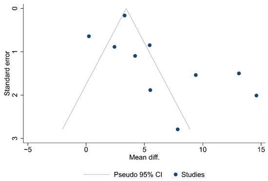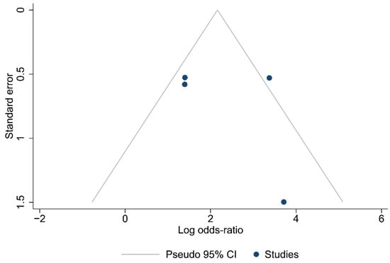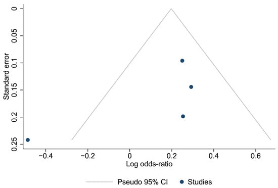 Funnel plots for the articles that were included in each of the carried out analyses are shown in Figure 2, Figure 3 and Figure 4. According to the graphical presentations and the result of the Egger’s test, which yielded values of p = 0.0089, p = 0.1184, and p = 0.4521 for each of the analyses performed, respectively, publication bias is likely to be present only in the first analysis.