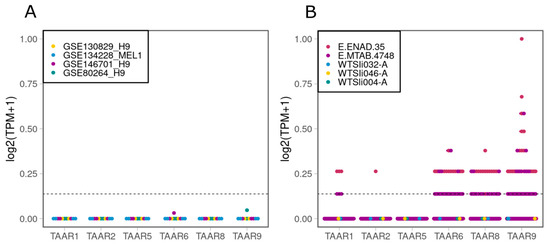 Expression of TAARs in datasets from open databases. (A) Datasets GSE130829, GSE134228, GSE146701, GSE 80264 from human ESCs. (B) Datasets E.ENAD.35, E.MTAB.4748 and datasets from WTSli004-A, WTSli032-A and WTSli046-A human IPSC lines. The cut-off value of 0.1 TPM is identified by the dotted line.