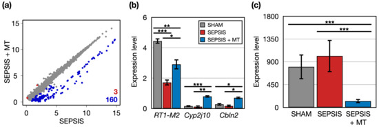 Next, we identified 163 DEGs in the comparison between SEPSIS and SEPSIS + MT and categorized their related functions and pathways through bioinformatics analysis (Figure 3a). Three genes (RT1-M2, Cyp2j10, and Cbln2) had significantly higher expression levels (1.7-, 6.3-, and 4.0-folds, respectively) in SEPSIS + MT compared to SEPSIS (Figure 3b). RT1-M2 expression followed a down–up pattern in the order of SHAM, SEPSIS, and SEPSIS + MT groups. No clear expression changes were observed for Cyp2j10 and Cbln2 between SHAM and SEPSIS. Additionally, we found 160 genes significantly downregulated in SEPSIS + MT. Their overall expression levels were significantly increased by 6.4-fold in SHAM and 8.1-fold in SEPSIS, but no significant difference between SHAM and SEPSIS (Figure 3c). They showed enrichment functionalities related to chromatin silencing and nucleosome positioning (Figure S1).