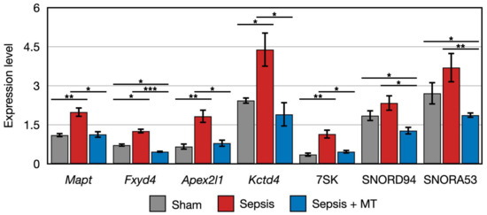 The expression of two genes (Cbln2 and RT1-M2) showed a 0.5-fold and 0.4-fold expression, respectively, in SEPSIS compared to SHAM (p < 0.005). In contrast, Cyp2j10 gene showed an approximately 5.2-fold increase in expression in qPCR analysis when comparing SEPSIS to SHAM (p < 0.001), and it exhibited a 50% downregulation in SEPSIS + MT compared to SEPSIS (Figure 5). Additionally, six genes (Fxyd4, Apex2l1, Kctd4, 7SK, SNORD94, and SNORA53) showed a 2.3-fold, 4.0-fold, 7.3-fold, 12.0-fold, 3.6-fold, and 4.1-fold increase, respectively, in SEPSIS compared to SHAM, and their expression levels were lower in SEPSIS + MT than in SEPSIS. However, the Mapt gene appeared to be downregulated by approximately 0.3-fold and 0.2-fold, respectively, in SEPSIS and SEPSIS + MT when compared to SHAM, but this difference did not reach statistical significance (Figure 6).
