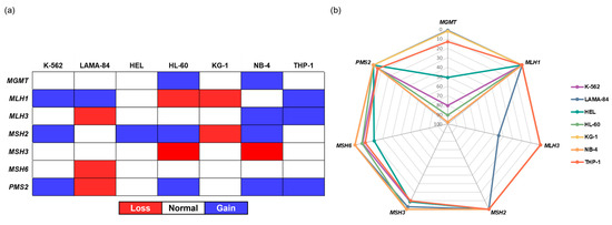The genetic and epigenetic alterations of the six genes involved in the MMR pathway, as well as one gene involved in the direct reversal of damage repair (MGMT), were assessed in CML and AML cell lines using methylation-specific multiplex ligation-dependent probe amplification (MS-MLPA). As shown in Figure 1a, the tested cell lines carried genetic alterations in the examined genes, and no differences were observed between the CML and AML cell lines. Among these, the MLH1, MSH2, and PMS2 genes appeared to be the most altered, as each presented genetic abnormalities in five different cell lines. The MSH6 gene was only altered on one CML cell line (LAMA-84). The HEL cell line presented only a genetic abnormality, specifically an amplification within the MSH2 gene. Similarly, both K-562 (CML) and THP-1 (AML) cell lines just carried amplifications, affecting three genes each. On the other hand, the KG-1 cell line carried only deletions in the MLH1 and MSH2 genes. The HL-60 and NB-4 cell lines carried the highest number of genetic alterations, each with five genes affected. The MGMT gene exhibited the highest degree of methylation (Figure 1b). Except for the KG-1 and LAMA-84 cells, all the other cell lines were either hemi-methylated (THP-1) or methylated. The tested CML and AML cell lines were demethylated for the MLH1, MSH2, and PMS2 genes. The MLH3 and MSH3 genes were only hemi-methylated in the LAMA-84 and THP-1 cell lines, respectively, and both the HEL and THP-1 cell lines were hemi-methylated in the MSH6 gene.