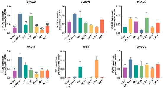 Expression levels of DDR-related genes in CML and AML cell lines. The expression of CHEK2, PARP1, PRKDC, RAD51, TP53, and XRCC6 was assessed by qPCR. The results are normalized to the HPRT gene and represent the mean ± standard error of the mean (SEM) of 3 independent experiments. Statistical analyses were conducted using one-way ANOVA and Tukey’s multiple comparisons test or Kruskal–Wallis test and Dunn’s multiple comparisons test (TP53). # p < 0.05, ## p < 0.01, and ### p < 0.001 (comparison with HL-60); ** p < 0.01, and *** p < 0.001 (comparison with LAMA-84).