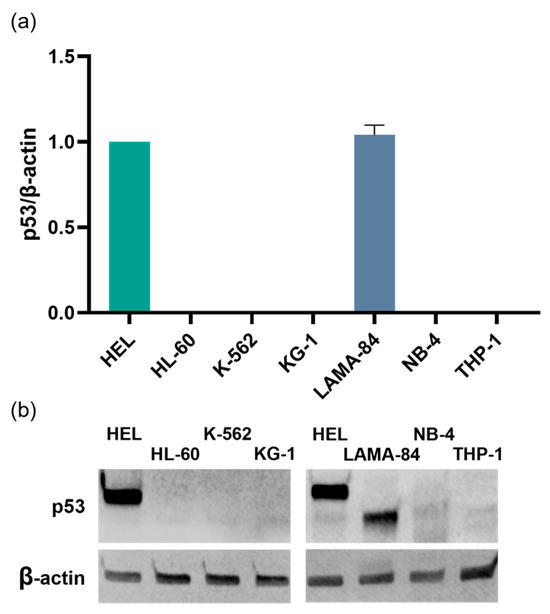 In addition to assessing gene expression levels, the p53 protein expression was analyzed using Western Blot. p53 expression was absent in the HL-60, K-562, KG-1, NB-4, and THP-1 cell lines, while it was exclusively detected in the HEL and LAMA-84 cells (Figure 3a). Notably, both the HEL and LAMA-84 (1.04 ± 0.06) cell lines exhibited similar levels of p53 expression. As shown in Figure 3b, in LAMA-84 cells, the p53 band exhibited a lower molecular weight compared to that in HEL cells.