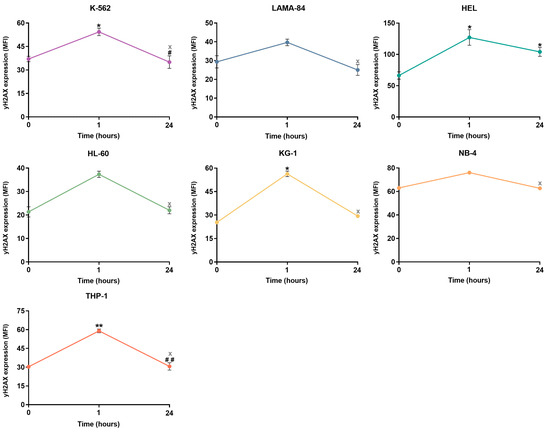 The cell lines were cultured at their optimal density and were exposed, for 30 min, to H2O2 (Sigma-Aldrich, St. Louis, MO, USA) (K-562, HL-60, KG-1, THP-1 = 17.5 μM; NB-4 = 13.5 μM; HEL = 10 μM; LAMA-84 = 7.5 μM) in a humidified atmosphere containing 5% CO2. The repair capacity of double-strand breaks was evaluated by assessing its kinetics through the expression levels of γH2AX. Following the genotoxic exposure, the cell suspensions were harvested, centrifuged for 5 min at 42× g, and cultured in a new medium. Then, at 1 h and 24 h post-exposure to H2O2, 0.5 × 106 cells were collected and subjected to a 5 min PBS wash at 300× g. The levels of γH2AX were quantified using the intracellular staining protocol outlined in Section 4.6. The results were presented as MFI measurement’s mean ± SEM of three independent experiments.