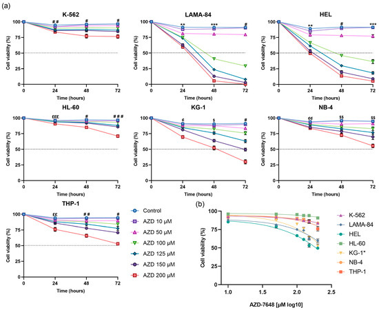 The effect of AZD-7648 (AZD) on cell viability in CML and AML cell lines. (a) Results are expressed as cellular viability, represented as a percentage (%) of viable cells. Results represent the mean ± SEM of 5 independent experiments. Data were statistically analyzed at each time point by comparison of the tested doses with the control using ordinary one-way ANOVA followed by Dunnett’s multiple comparisons test or Kruskal–Wallis test followed by Dunn’s multiple comparisons test. (b) Log dose–response viability curve of AZD-7648 after 24 or 48 (KG-1*) hours of treatment. Results represent the mean ± SEM of 5 independent experiments. ** p < 0.01, and *** p < 0.001 (control vs. 50, 100, 125, 150, and 200 μM); $ p < 0.05, and $$ p < 0.01 (control vs. 100, 125, 150, and 200 μM); # p < 0.05, ## p < 0.01, and ### p < 0.001 (control vs. 125, 150 and 200 μM); ¢ p < 0.05, and ¢¢ p < 0.01 (control vs. 150, and 200 μM); ££ p < 0.01, and £££ p < 0.001 (control vs. 200 μM).