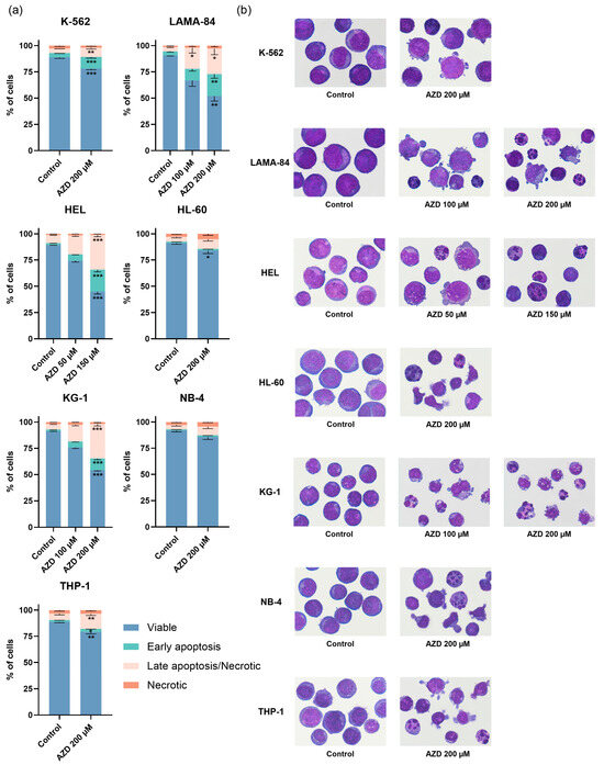We evaluated the mechanism of cell death activated by AZD-7648 at the doses that induced a decrease in cell viability of approximately 25% and 50% within the doubling time of each cell line (24 h for all except KG-1, which had a doubling time of 48 h) (Figure 6). No statistical differences were observed in the HEL or KG-1 cells following treatment with 50 µM and 100 µM of AZD-7648, respectively. Still, compared to the control, there was a corresponding increase in the percentage of cells in early apoptosis, by 3.4-fold and 4-fold, and in late apoptosis/necrosis by 2.4-fold and 3.1-fold. After treatment with the higher doses, a significant rise in early apoptotic (HEL: 11.7-fold, p < 0.001; KG-1: 7.9-fold, p < 0.001) and late apoptotic/necrotic cells (HEL: 4.3-fold, p < 0.001; KG-1: 6.3-fold, p < 0.001) was observed in both cell lines. This increase was linked to a decrease in the percentage of viable cells (p < 0.001). In the LAMA-84 cell line, treatment with 100 µM of AZD-7648 led to an increase in the percentage of early apoptotic (2.8-fold) and late apoptotic/necrotic (5-fold, p < 0.05) cells, compared to untreated cells. The treatment with 200 µM of the inhibitor significantly increased the early and late apoptotic LAMA-84 cells (5.3-fold, p < 0.01; 6.1-fold, p < 0.05, respectively). The effect of the highest tested dose was evaluated in the cell lines where the IC50 was not reached (HL-60, K-562, NB-4, and THP-1). Mainly, the K-562 and THP-1 cells treated with 200 µM of the inhibitor showed a decrease in viable cells, accompanied by a significant increase of 2.6-fold (p < 0.001) and 1.7-fold (p < 0.05) in the early apoptotic and 2.1-fold (p < 0.01) and 2.4-fold (p < 0.01) in the late apoptotic/necrotic cells, respectively, compared to the control. Despite the absence of statistical difference, a 2-fold increase in the late apoptotic/necrotic population was noticeable in the HL-60 and NB-4 cells following inhibitor treatment (Figure 6a).