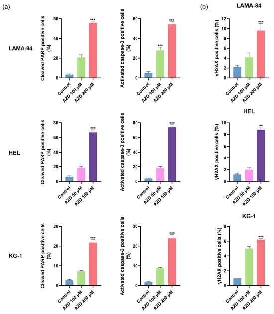 As represented in Figure 7b, the treatment with AZD-7648 also led to an increased percentage of cells positive for γH2AX (a marker for DNA damage) compared to untreated cells. This increase was particularly evident in the HEL cell line after treatment with 150 µM (7.3-fold, p < 0.01) for 24 h. The tested doses in LAMA-84, 100 µM, and 200 µM increased γH2AX-positive cells by 1.9-fold and 4.4-fold (p < 0.001), respectively. For the KG-1 cell line, treatment with 100 µM and 200 µM of AZD-7648 for 48 h led to similar increases in γH2AX-positive cells (5-fold and 6.2-fold, p < 0.001, respectively).