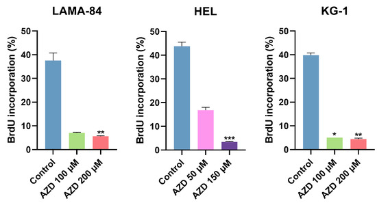 The incorporation of BrdU, a marker for cell proliferation, was assessed in the LAMA-84, HEL, and KG-1 cell lines after treatment with different concentrations of AZD-7648 for 24 h, or 48 h in the case of KG-1 (Figure 8). Compared to the control, the AZD-7648-treated cells showed a decrease in cell proliferation. In HEL cells treated with 50 µM of AZD-7648 and LAMA-84 with 100 µM, the percentage of BrdU incorporation decreased 2.6-fold and 5.4-fold, respectively. This reduction was more pronounced in these cell lines when treated with a higher concentration (HEL: 12.9-fold, p < 0.001; LAMA-84: 6.7-fold, p < 0.01). In the KG-1 cell line, treatment with 100 µM and 200 µM of the inhibitor for 48 h resulted in significant decreases of 8-fold (p < 0.05) and 9-fold (p < 0.01) in cell proliferation, respectively.