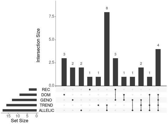 Through performing a traditional GWAS, we identified 29 SNPs associated significantly with IS. They were obtained by five tests that corresponded to different models of inheritance (genotypic, dominant, and recessive) and types of tests (the Cochran–Armitage test for trend and the allele frequency test). The minimum number of SNPs was revealed via the recessive model (N = 4) and the maximum number of SNPs was revealed via the allelic test (N = 18). As seen in Figure 1, the lists of SNPs obtained using different models were almost unique. The power of the tests considered depends on many factors (sample size, inheritance model, MAFs, Hardy–Weinberg equilibrium, etc.), which makes it difficult to interpret the differences in the numbers of significant SNPs obtained [26]. Nevertheless, when the particular inheritance model for most of the loci is not known, the results of all modeling can be suggestive and considerable. Therefore, the lists of significant SNPs obtained by five tests are worth considering.