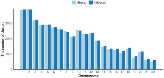 Figure 3. The number of clusters per chromosome obtained by DBSCAN and HDBSCAN.