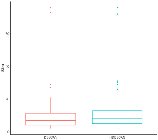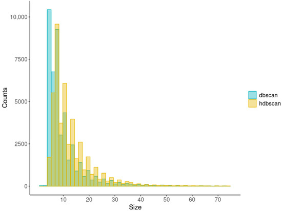 The histograms of cluster sizes for DBSCAN and HDBSCAN are provided in Figure 4. Both had right-skewed distributions with long tails. According to the Mann–Whitney U test, these distributions are different (p-value < 2.2 × 10−16). DBSCAN showed the highest number of clusters sized five (N = 10,354), while HDBSCAN demonstrated the most frequent cluster sized six (N = 5515). DBSCAN formed more clusters sized lesser than or equal to seven than HDBSCAN, while HDBSCAN formed more clusters sized greater than or equal to eight than DBSCAN.