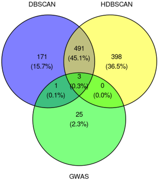 Figure 7. Venn diagram illustrating the overlap of the three approaches with each other. The number of risk polymorphisms obtained by classic GWAS and cluster-based approaches (DBSCAN and HDBSCAN) are depicted.