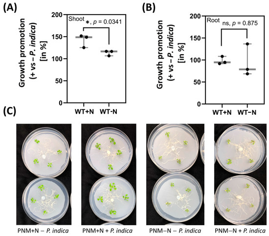 Shoot (A) and root (B) growth promotion of A. thaliana seedlings, which were either grown on full medium (+N) or N-limited medium (−N), in the presence of P. indica for 5 days. The % of growth promotion by the fungus was determined for 20 shoots and roots, the plant material grown on the respective media without the fungus was set as 100%. The percentage was determined for each replicate separately since the starting weight of plants was slightly different for the three independent replicates. All three replicates show the same trend of growth promotion. (C) shows representative pictures of the co-cultures at harvesting time. Statistic significant differences were analysed using one-way ANOVA (Holm–Sidak test). * significant, ns = not significant.