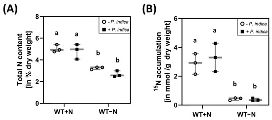 A well-studied endophytic fungus is Piriformospora (Serendipita) indica, which interacts with numerous host plants and promotes their growth and resistance against biotic and abiotic stresses [10,11]. The stimulation of the growth of its hosts suggests that the fungus promotes nutrient acquisition, including nitrogen. An effect of P. indica on nitrate uptake and the nitrogen metabolism in the hosts has been reported repeatedly. On a full medium, the fungus promotes nitrogen accumulation and the expression of nitrate reductase in Arabidopsis thaliana [12]. In sunflower, P. indica increases the absorption of nitrogen by the root [13]. Strehmel et al. [14] showed that the concentration of nitrogen-rich amino acids decreased in inoculated A. thaliana plants. Ghaffari et al. [15] proposed that the nitrogen metabolism plays an important role in systemic salt-tolerance in leaves of P. indica-colonized barley. Furthermore, Lahrmann et al. [16] showed that the P. indica ammonium transporter Amt1 functions as a nitrogen sensor mediating the signal that triggers the in planta activation of the saprotrophic program. In Chinese cabbage, the amino acid γ-amino butyrate in particular is de novo synthesized in colonized roots [17]. Bandyopadhyay et al. [18] demonstrated that P. indica, together with Azotobacter chroococcum, facilitates the higher acquisition of N and P in rice. P. indica also improves chickpea productivity and N metabolism in a tripartite combination with Mesorhizobium [19]. Finally, Serendipita williamsii does not affect P status but C and N dynamics in AM tomato plants [20]. These examples highlight the importance of the N metabolism on numerous beneficial effects of P. indica for different plant species; however, how the fungus influences the host N metabolism is not clear. In this study, we use the model plant A. thaliana to investigate how P. indica interferes with N uptake and metabolism under N-limiting conditions.