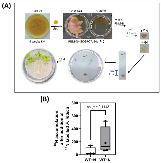 (A) Experimental set-up of sterile A. thaliana seedlings co-cultivated with 15N-labelled P. indica. To obtain labelled fungal material, fungal plugs grown on KM plate were transferred to a modified liquid N-free KM medium supplemented with 10 g/L ISOGRO®-15N and incubated for 14 days in a well plate. The fungal material was separated from the medium, washed carefully with PNM−N and cut into 25 mm2 pieces. The fungus was placed onto the nylon membranes with 1 cm distance to the roots. The co-cultures were incubated for 14 days. For further details, see the Section 4. (B) 15N label in the shoots of seedlings that were exposed to the 15N-labelled hyphae on either full (white) or N-limited (grey) media. The accumulation of 15N was determined in the dried leaf material of 20 colonized shoots, 14 days after the beginning of the co-culture. For experimental details, see the Section 4. Based on three independent experiments. ns, not significant; analysed via ranked t-test (Mann–Whitney test).
