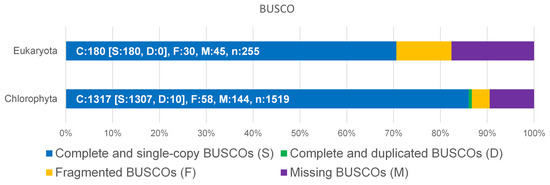 The genome of D. tertiolecta was sequenced by a PacBio Sequel IIe NGS sequencer resulting in long, high-fidelity (HiFi) sequences with a yield of 7.5 gb of HiFi reads at a quality of >Q20 (Figure S1, Supplementary Materials). The result of the assembly provided a total of 212 MB as primary contigs with 35-fold coverage. To assess the completeness of the genome, BUSCO analysis was performed with the genome sequence versus Eukaryota and Chlorophyta (Figure 1). Although the available datasets are limited to Chlorophyta, more than 86% complete and single-copy BUSCOs could be matched.