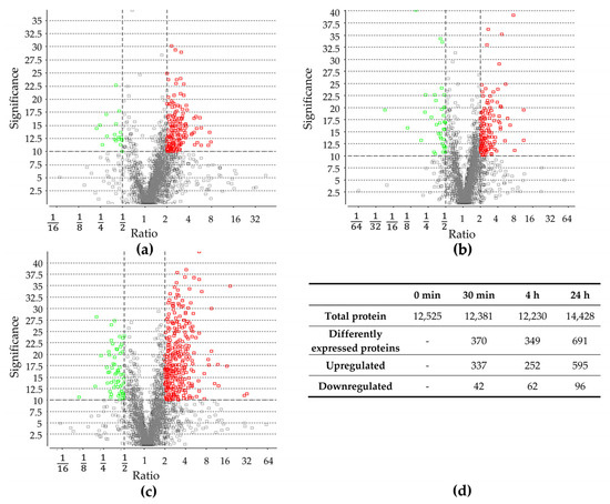 Differentially expressed proteins after (a) 30 min, (b) 4 h, and (c) 24 h of increase in salt concentration compared to proteins present before salt stress. Volcano plot of proteins, which were quantified with LC-MS/MS and PEAKS Studio software. Each point represents the difference in expression (fold change/ratio) plotted against the level of statistical significance. Proteins represented by a red and green circle exhibit significantly in- or decreased abundance, respectively. Grey circles did not exhibit significantly changed abundance. (d) Number of total identified proteins before and after 30 min, 4 h, and 24 h of salt stress; number of total differentially expressed proteins, as well as down- and upregulated ones after 30 min, 4 h, and 24 h of salt stress.