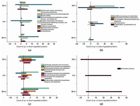 The Cluster of Orthologous Groups (COG) analysis, shown in Figure 3, confirms a higher number of proteins to be up- rather than downregulated. Furthermore, proteins related to energy production and conversion, amino acid transport and metabolism, and posttranslational modification exhibited the most significant changes in abundance. A substantial upregulation of proteins associated with RNA processing and modification, translation, ribosomal structure, and biogenesis, was observed particularly at 24 h of osmotic change, underpinning a trend already starting 4 h after the change in salt concentration.