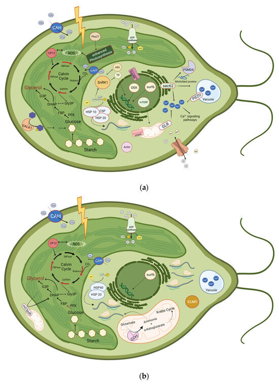 Some interesting proteins with elevated abundance after 4 h are a potassium/proton antiporter (3.64-fold) and a mitochondrial transcription termination factor (mTERFs) (7.43-fold) (Table 1). Additionally, CP12 was upregulated 4.25-fold, which is a small, redox-sensitive protein common in most photosynthetic organisms, such as higher plants, cyanobacteria, and green algae [88]. CP12 regulates the Calvin–Benson cycle (CBC) by mediating the formation of a complex between phosphoribulokinase (PRK) and glyceraldehyde-3-phosphate dehydrogenase (GAPDH) [88,89,90]. Moreover, a study conducted by Tamoi et al. [89] demonstrated that CP12 proteins are able to bind NADPH, allowing them to control the flow of electrons from Photosystem I to NADPH [88,89,90]. Thus, CP12 plays a crucial role in protecting cells against oxidative stress and suppressing the production of reactive oxygen species (ROS) [89]. Algae typically generate ROS, which can function as secondary messengers in numerous cellular processes. When exposed to abiotic stresses, the balance between ROS production and suppression is disrupted, usually resulting in an increased ROS level triggering oxidative stress [91].