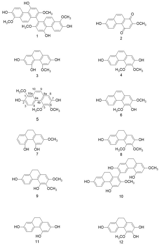 - Sun, M.H.; Ma, X.J.; Shao, S.Y.; Han, S.W.; Jiang, J.W.; Zhang, J.J.; Li, S. Phenanthrene, 9,10-dihydrophenanthrene and bibenzyl enantiomers from Bletilla striata with their antineuroinflammatory and cytotoxic activities. Phytochemistry 2021, 182, 112609. [Google Scholar] [CrossRef]