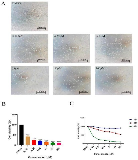Cell morphological and survival rate of compound 5 towards HeLa Cells. (A) Microscopic morphological data of HeLa cells treated with different concentrations of compound 5 for 48 h. (B) Survival rate of HeLa cells treated with different concentrations of compound 5 for 48 h. (C) Survival rate of HeLa cells treated with different concentrations of compound 5 at different times. The statistical results are expressed as the mean ± SD, n = 3, **** p < 0.0001 vs. control group.