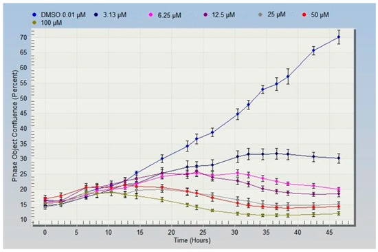 The 96-well plates treated with different concentrations (3.125 mM–100 mM) of compound 5 were placed in the IncuCyte Zoom living cell imaging system (Essen BioSciences, Ann Arbor, MI, USA) with proper modifications [44]. The cell images were collected regularly to observe the changes of cell growth dynamically. The time interval of image collection was set to 4 h and the images were collected with a 10× lens. The cell areas in each image were automatically identified by the system’s built-in analysis software. The cell confluence rate under different treatment conditions was calculated with IncuCyte ZOOM 21 CFR Part software Module (Essen BioScience, USA).