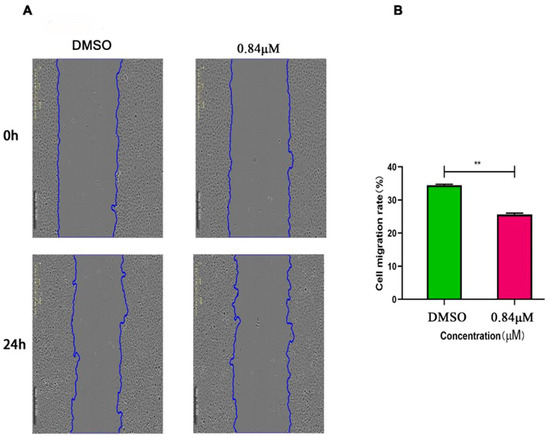 Compound 5 inhibited the migration of HeLa cells. (A) The migration of HeLa cells under the microscope after treatment with DMSO and compound 5 for 0 h and 24 h. (B) The average migration rate of HeLa cells after treatment with compound 5 for 24 h. The statistical results are expressed as the mean ± SD, n = 3, ** p < 0.01 vs. control group.