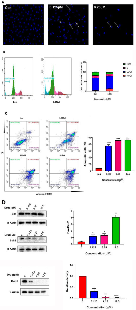 To perform the apoptosis analysis, Hoechst 33258 was used to provide blue fluorescence, which may indicate the progression of apoptosis. Figure 5A indicated the obvious HeLa apoptosis due to the treatment with compound 5 with increasing concentration. Then, single PI staining combined with flow cytometry was carried out to detect apoptosis (Figure 5B). The results showed that after the treatment with compound 5, the proportion of SubG1 phase cells increased, indicating that compound 5 could induce apoptotic cell death in HeLa cells. Then, AnnexinV-FITC/PI staining was used to measure the percentage of apoptotic cells. As shown in Figure 5C, the apoptosis rate increased from 7.15% in the control group to 93.46% (compound 5, 12.5 μM); thus, a concentration-dependent manner for the activity of compound 5 towards HeLa apoptosis was again identified. Furthermore, the apoptotic protein levels were evaluated via Western blot analysis; the elevated ratio of Bax/Bcl-2 (Figure 5D) also confirmed that compound 5 could induce apoptotic cell death in HeLa cells.
