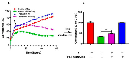 P53 mitigates compound 5’s inhibition of the proliferation of HeLa cells. (A) The confluence rate curve of HeLa cells after transfection with P53 siRNA and treatment with compound 5 for 48 h. (B) The confluence rate of HeLa cells after transfection with P53 siRNA and treatment with compound 5 for 48 h. The statistical results are expressed as the mean ± SD, n = 3, ** p < 0.01 vs. control group.