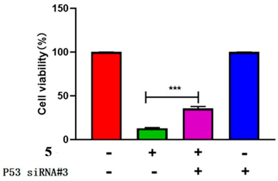 The survival rate of HeLa cells after transfection of P53 siRNA and treatment with compound 5 for 48 h. The statistical results are expressed as the mean ± SD, n = 3, *** p < 0.001 vs. control group.