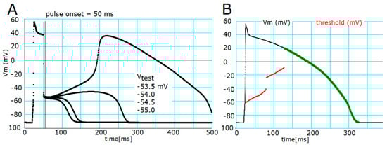 The first theoretical study of cardiac electrophysiology using detailed mathematical descriptors was presented by Noble in 1962 []. He modified the Hodgkin–Huxley equations of squid giant axon and combined these with the cable theory to quite accurately reproduce many of the electrical properties of Purkinje fiber APs and pacemaker potentials. Purkinje fiber taken from the conduction system of juvenile sheep hearts had an exceptionally large diameter and length, which allowed extrapolation of the theory developed for the squid nerve to the cardiac muscle preparation after some modifications on parameters. After the epoch-making experimental milestones of the introduction of both dissociated cardiomyocyte preparations [,,] and the patch clamp technique [] in the next decades, the characteristics of ion channels and transporters were extensively clarified in the isolated cardiac myocytes from various cardiac tissues. These milestones made possible the development of various cardiac myocyte models based on the experimental data on isolated single myocytes []. Since then, cardiac myocyte models have become increasingly detailed and have been validated based on experimental data (for human ventricular myocyte models, ORd model [], GPB model [], Asakura et al., [], Himeno et al. [], etc.).