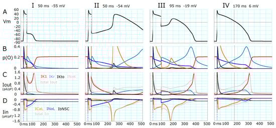 When the hyperpolarization from the plateau potential was increased only by 1 mV (to −54 mV), the slope of the slow depolarization was inverted from a negative (at −55 mV) to a positive direction (column II). As expected, no significant changes were obvious in the initial levels of p(O) or the amplitudes of INaL, IKr, IbNSC, and IK1 immediately after the break in the voltage clamp pulse in comparison to the pulse to −54 mV. However, an evident exponential rise in the L-type calcium current (ICaL) amplitude was observed 200 ms after the pulse (Figure 3D); the more the p(O)ICaL increased, the more depolarized the membrane became, and vice versa. The accompanying changes in INaL, IKr, IbNSC, and IK1 may occur secondarily due to the membrane depolarization caused by ICaL. The final discharge of an EAD-like event is caused by the much-enhanced positive feedback cycle of ICaL activation.