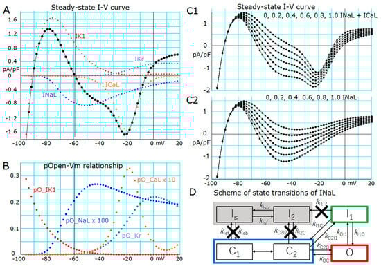 The N-shaped I-V curve with two stable equilibrium potentials and one unstable equilibrium potential of the hVC model. The I-V curves in (A,C1,C2) were measured by applying the voltage clamp test pulses of 4.9 s in duration given every 2 mV step from the holding potential of −80 mV. Current magnitudes saturated within the duration of test pulses at the end of individual test pulses, and were plotted in these figures. Additionally, (A) shows total whole cell current (black) and current components IK1, IKr, INaL, and ICaL depicted in different colors as indicated. The steady-state p(O)s of major ion channels were plotted in (B). Note that p(O)INaL and p(O)ICaL were plotted after multiplication by 100 and 10, respectively. (C1,C2) shows the influence of increasing the amplitude of INaL on the appearance of equilibrium points in the presence and the absence of ICaL, respectively. Increasing the amplitude of INaL shifted the N-shaped I-V curve negatively. All I-V and p(O)-V relationships share the same abscissa of Vm. In (D), the state of slow inactivation, Is and the transitional inactivated state, I2 of INaL, were shaded by gray color to indicate that these states were frozen, namely, the state transition from other states was totally prevented as indicated by cross marks. Thereby, repetitive state transitions between I1 and O produce continuous bursts of brief openings of the channel, and ‘late scattered mode’ of Na channel [] (kI1O is close to kOI1) during a clamp pulse to depolarized potentials. If integrated over bursts with numerous numbers of brief openings, the whole-cell INaL maintains a significant amplitude during depolarization. With an intact transition scheme, INaL gradually decreases in amplitude through the state transition from O to (Is + I2) when the membrane is depolarized. The state transition between the two closed states (C1,C2) was assumed to be instantaneous on the Vm jump; the probability of (C2) increases with membrane depolarization. In the state transition of transient sodium current (INaT) (see Supplementary Materials) the I1 state is absent, and the inactivation occurs through a state transition from O to I2 at transition rate kOI2, which has the same magnitude as kOI1.