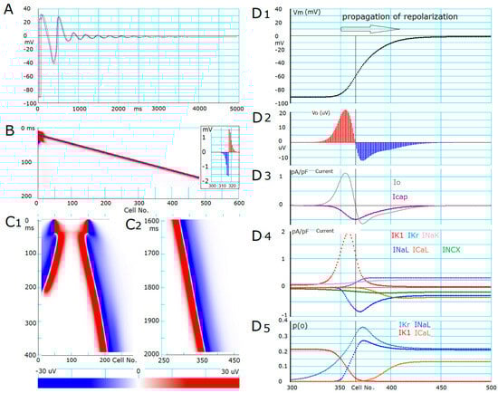 Propagated repolarization in a linear strand of the EAD-prone myocytes in comparison to that of excitation. Panel A shows the time course of Vm, moving from the resting membrane potential (−91 mV) to the second stable equilibrium potential (−2 mV) in the myocyte strand, in which the deeply inactivated states (Is + I2) of INaL were removed. Panel (A) indicates Vm recordings in cell No. 1 (blue) and 17 (red). The AP was evoked by applying a depolarizing pulse to cell No. 1 in the 1D strand of the hVC model. The Vm stabilized at about −3 mV at the end of the record in all myocytes within the strand. Panel (B) indicates the propagation of the O/I pattern (propagation of excitation) along the myocyte strand. The inset shows the stable O/I pattern of Vo; positive Vo evoked by outward whole-cell current, Io (red), or negative Vo due to inward Io (blue). Note, that the cell number on the abscissa of the inset is the same as in panel B, but the scale of the Vo is reduced by 100 times. Panels (B,C) indicate the movement of O/I patterns (propagation of repolarization) along the myocyte strand by using the color code of Vo shown at the bottom of panel (C). The O/I patterns illustrated in (C1,C2) were obtained at different recording times. See text for the explanation of panels (D1–D5). Note that p(O)INaL and p(O)ICaL were plotted after multiplication by 100 and 10, respectively, in panel (D5). The time scale shown in (D5) is common for all (D1–D5). The arrow head in (D1) indicates the direction of the propagation of repolarization. The scaling factor of IK1 = 1.2 was used in this simulation. Note that the scale of the Vo is reduced by 100 times in panel (C) if compared to that in panel (B).